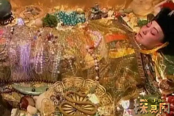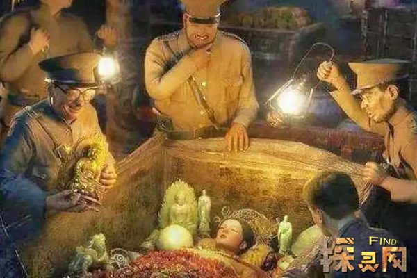 孙殿英盗墓时,当他炸开慈禧的陵墓后,劈开金椁内棺一看,里面全是珍珠、玛瑙、宝石、玉器、金银器皿等珠宝首饰,他们立即收罗走了围绕在尸体周围的大件宝贝,比如翡翠西瓜、蝈蝈白菜、玉石莲花、珊瑚树等,之后又把尸体下方的珠宝全部抽走,就连慈禧身上的龙袍也被扒下来了。