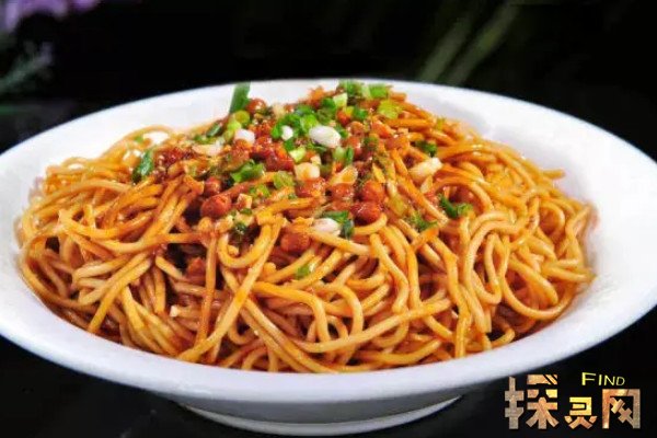 四川担担面是成都地区著名的小吃,面粉擀制成面条,煮熟后加上炒制好的猪肉末即可,面条细薄,卤汁酥香,咸鲜微辣,担担面经常作为筵席点心出现在宴席上。