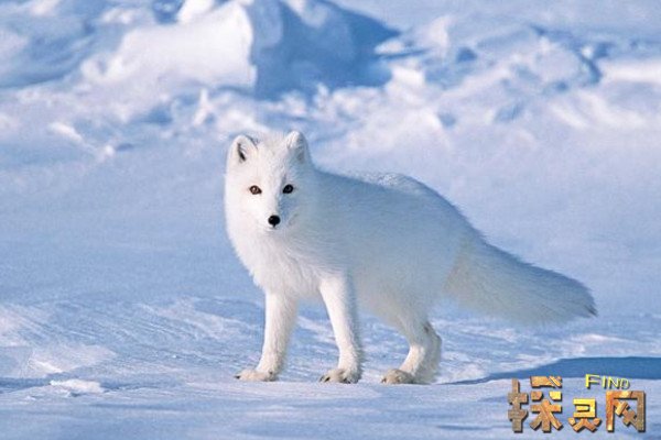 北极狐的面部狭窄,吻部很尖,耳朵短小而圆润,脚部和脸颊后方都长有密集的长毛,适合在冰天雪地中行走,尾巴蓬松,尖端为白色,主要分布在北极圈附近,它们的耐寒性极强,即使在零下70℃的地方也能顽强生存。