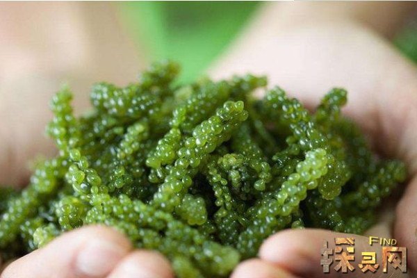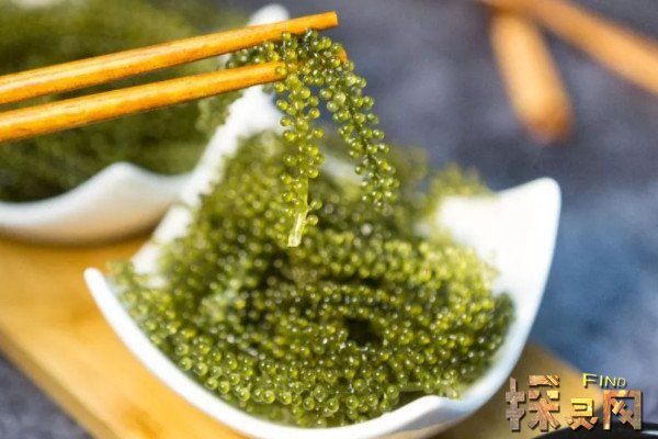 此外,还有一种绿藻类食物也被称为海葡萄,它的学名为长茎葡萄蕨藻,外形看上去圆润而饱满,犹如一串串晶莹剔透的葡萄一样,其口感和外观都神似鲑鱼卵,所以也被称为绿鱼子,吃起来有噗呲噗呲的感觉,散发出鲜美的咸香味,颇有鱼子酱的神韵,被誉为植物界的“绿色鱼子酱”。
