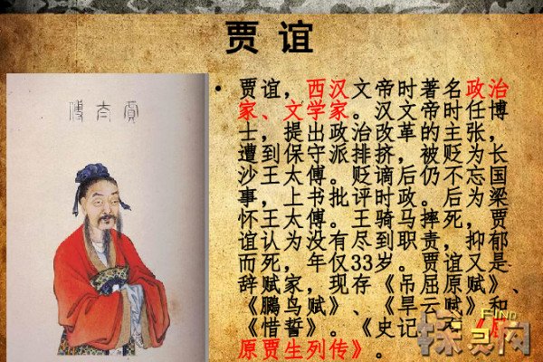 贾谊在汉文帝时期担任朝廷中的博士,但因为受到大臣周勃和灌婴的排挤,最后被贬谪为长沙王太傅,他在三年后被梁怀王所重用,结果梁怀王坠马而死,他因为深感内疚也抑郁身亡。贾谊的主要作品有散文和词赋两大类,散文以政论文为主,风格朴实,议论酣畅,词赋全部为骚体,形式呈散体化。
