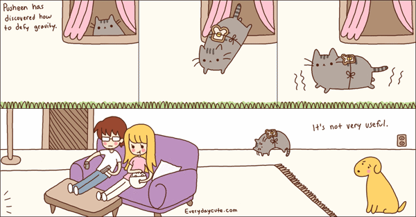 这样将来黄油猫跳下来之后岂不是永远也落不下来了,成为了一只永远不停旋转的永动机了?既不能猫脚着地,因为是黄油面包背面;也不能黄油面包这面掉落地上,因为猫落地之后一定会脚先着地。这样这只可怜的猫咪好似就这样永远不能落下来,就像上面的那只可怜的猫咪的样子...