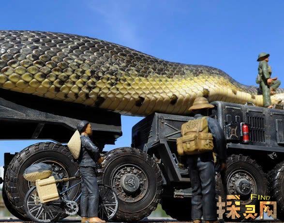 不过若是你仔细观察后,你会发现巨蛇的照片看起来就像在卡车上一条真正的蛇。这一照片似乎是在近距离拍摄的,看起来蛇也非常大。不过这些照非常低质量,模糊的画质这使得很难辨别照片的真伪。不过经过探灵网大海捞鱼般的筛选终于找到一个更高分辨率的版本,果然当你看到这些高清晰度的图像,可以清晰看到这不过是一个玩具卡车和玩具士兵,旁边似乎是一个普通的蛇...
