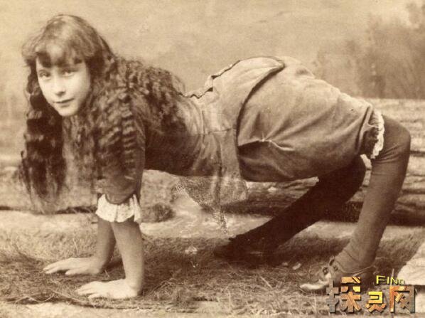 这名女子被称为骆驼女孩是因为她的膝盖是往相反的方向长得,正如大家从图上看得一样,她可以用她的手和脚很好的走路。过去的四年半,她随着杂技团巡演各地,现在已经1886年了,她打算放弃她的杂技生涯,转向学习来让自己适合另一个职业。