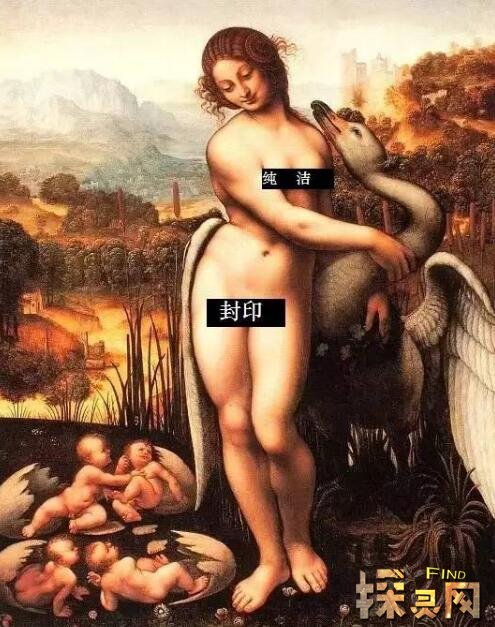 在这幅《勒达与天鹅》中,全裸的勒达占据画面中心,右手搂抱着鹅颈。她体态丰腴,脸上挂着“蒙娜.丽莎”般的微笑。天鹅张开右翅紧抱丽达,仰望着她的面孔似欲亲吻,勒达羞涩地将面庞避向右肩。