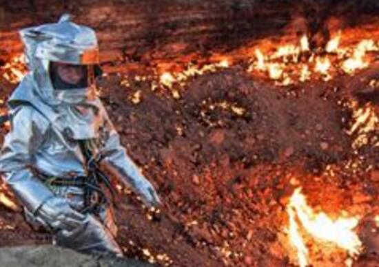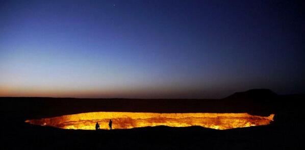土库曼斯坦地狱之门是在土库曼斯坦境内达瓦札村北约10公里处,和昆仑山地狱之门不同,只是一座熊熊燃烧的火焰大坑!这里曾经在前苏联的统治之下,1971年当前苏联地质学家进行钻探时,他们发现了这里居然在极浅的地层中蕴含着极其丰富天然气,地质学家们喜出望外,连忙在此准备好好利用这些天然气搞出一番做为。