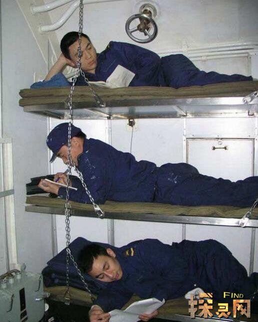 潜艇舱室空间非常狭小:睡觉要用可拆卸式吊铺,睡时装上,起床拆下,否则就会影响正常的通行或操作。水兵睡觉的帆布床是上下用吊链相连的,有三层、四层不等,层与层之间只能侧仰而入,人要翻个身都不是件容易事。