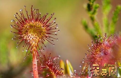 茅膏菜是一种颜色和形态都特别好看的食虫植物之一,它的茎上会长出非常多细小的软毛,软毛尖端有透明的胶水,可以看到上面这株茅膏菜上面已经粘上了一些小蚊子。