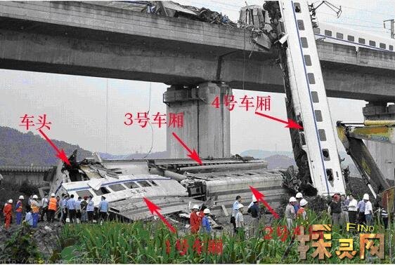 D3115次动车遭到雷击后失去动力停车,D301次列车追尾,导致车厢挤压侧翻,1.2.3车厢脱轨坠落桥下,4车厢与地面垂直悬浮。
