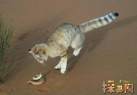在沙漠中生存着一种猫科动物,这就是沙丘猫。大家在沙漠中不易见到它,因为其一体型比较小,其二外表颜色和沙漠差不多,具有非常好的隐藏能力,一般不会发现它。这种猫大多在晚上进行活动,常以老鼠、蜥蜴、昆虫为食。