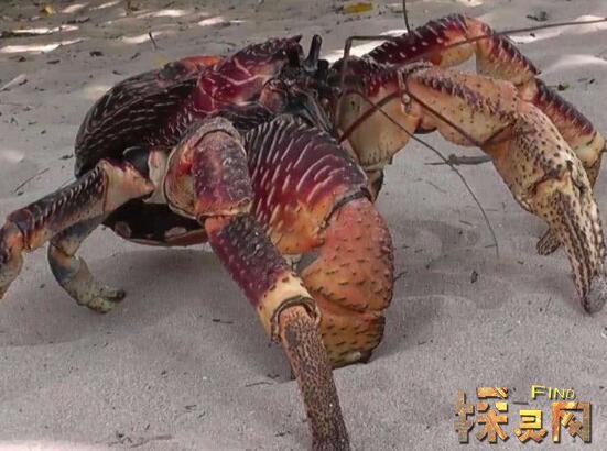 椰子蟹是最大陆生节肢蟹类,体长可达到一米,体重12斤,外壳异常坚硬,长有两只强壮有力的巨螯。在生活中擅于爬树,常常吃一些椰子果肉。椰子蟹生长在海边热带雨林中,寿命达到60年,每年生长比较缓慢,仅为1-2厘米。肉质鲜嫩,数量稀少,已经成为濒临灭绝动物。