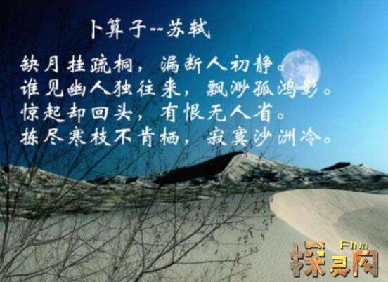 这是苏轼于1082年黄州定慧院所作,缺月挂疏桐,漏断人初静。谁见幽人独往来,缥缈孤鸿影。惊起却回头,有恨无人省。拣尽寒枝不肯栖,寂寞沙洲冷。整首诗意中设境,托物寓人,境界高妙;并借以月夜孤鸿生动形象来表达自己思想,流露出孤高自许、蔑视流俗的心境。
