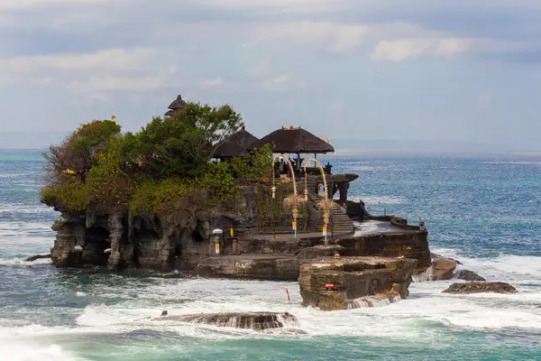 海神庙是巴厘岛最重要的海边寺庙之一,它诞生于16世纪,位于海边的一块巨大岩石上,每当涨潮的时候,岩石就会被海水所包围,海神庙于陆地隔绝,孤零零的屹立在海水之中,巨岩的一处岩壁之中,有几条有毒的海蛇,传说它们是海神庙的守护神,防止入侵者。
