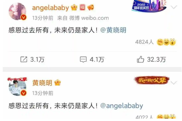 黄晓明和杨颖离婚了,在2022年1月28日,黄晓明和杨颖在社交平台上发文称感恩过去,未来仍是家人,简简单单的一句话就公布了离婚的消息,不少人看到后十分吃惊,也很好奇两人离婚的原因,也有吃瓜路人表示,两人之间的感情会破裂早就有预兆了。