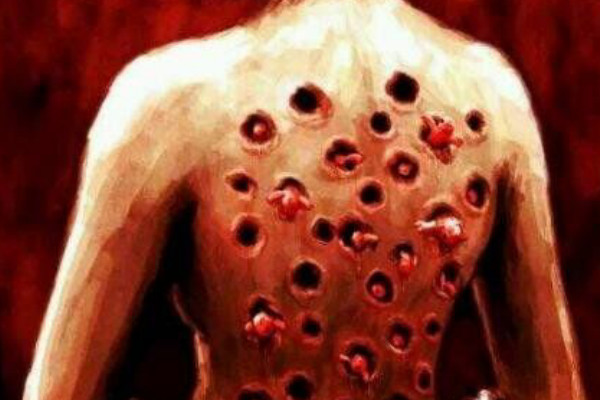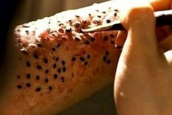 后来,男孩将红疙瘩全都抓破了,他以为结痂后就会自己好起来,殊不知男孩背后的疙瘩结痂后就开始脱皮,导致整个背部的皮都脱完了,接着就出现了密密麻麻的洞,看上去非常恶心,最恐怖的是,每个洞中都有肥嘟嘟的虫卵,就像玉米粒镶在皮肤中一样,和莲蓬十分类似,看完令人犯恶心。