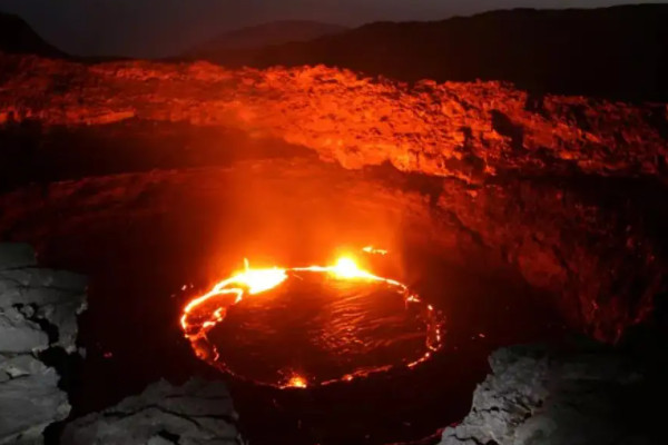 尔塔阿雷火山位于埃塞俄比亚东北部的阿尔法地区,是地球上最干燥、最低洼的地区之一,这里的岩浆非常活跃,就像湖水一样把这里包围,常年保持这种罕见的景象,人来无法踏足。