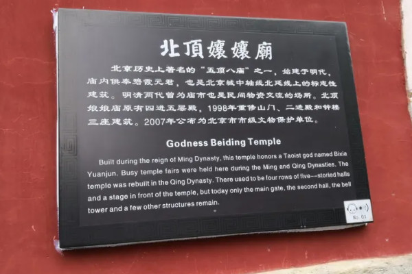 从这之后,国家又重新翻修了北顶娘娘庙,不少中外游客都前来祭拜,香火极其旺盛,成为了北京的一处著名景点。近两年,北顶娘娘庙的三、四进院配殿及山门值房的修复工程已经完工,它将进一步丰富奥运功能的人文内涵,并且北顶娘娘庙早在2003年就被批准成为当地第七批重点文物保护单位。