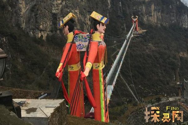 2019年底,四川绵阳九皇山景区新建了玻璃桥,从此便能轻松走过这一段路,该悬索桥的桥塔是两对身穿传统服饰的男女,网友称看上去“十分惊悚”。